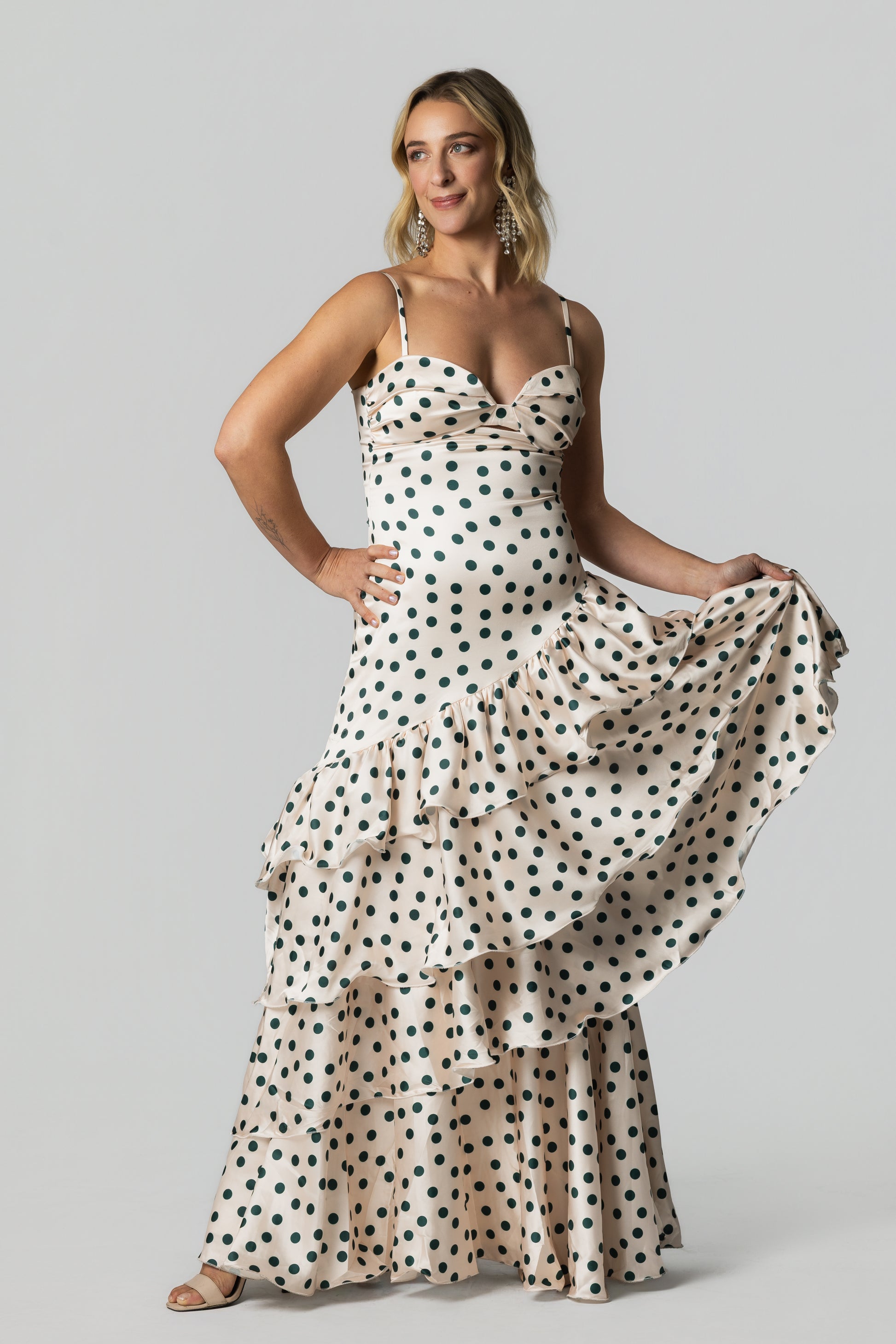 Satin Polka Dot Tiered Ruffle Maxi Dress – Ivory/Green