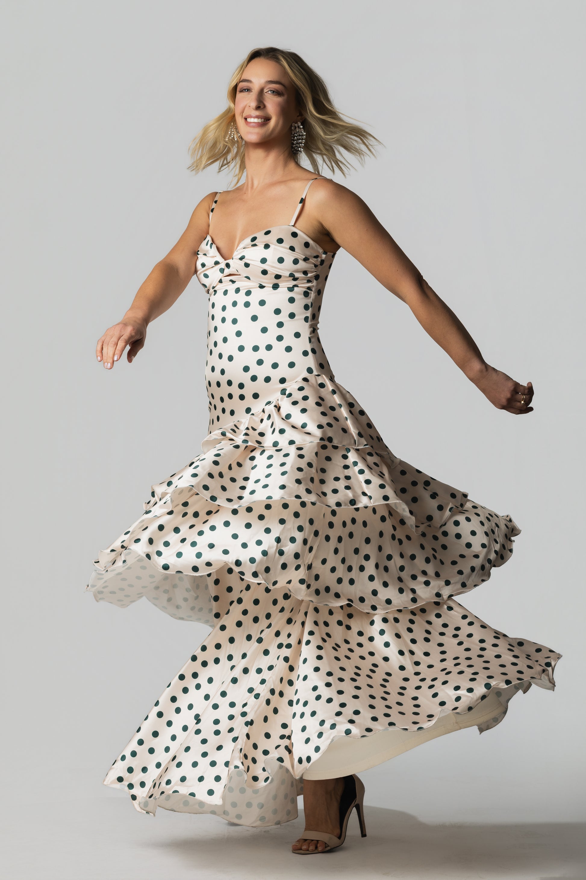 A showstopping satin maxi with classic polka dots, a sweetheart neckline with subtle center cutout, adjustable straps, and a dramatic tiered ruffle skirt that moves beautifully. Perfect for romantic dinners, formal parties, and special events.